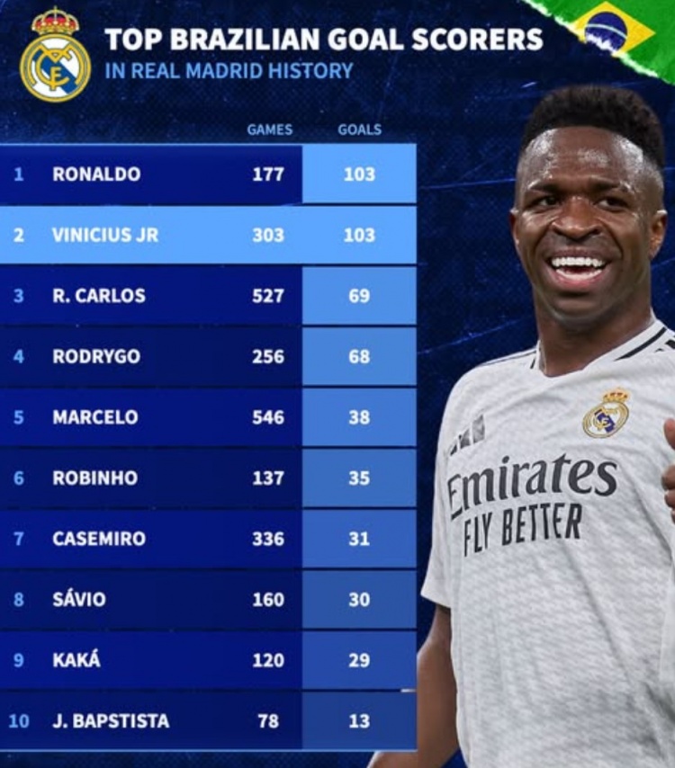 3月16日訊 《轉(zhuǎn)會市場》統(tǒng)計了皇馬歷史巴西球員進(jìn)球榜,大羅和維尼修斯均打進(jìn)103球并列最多。