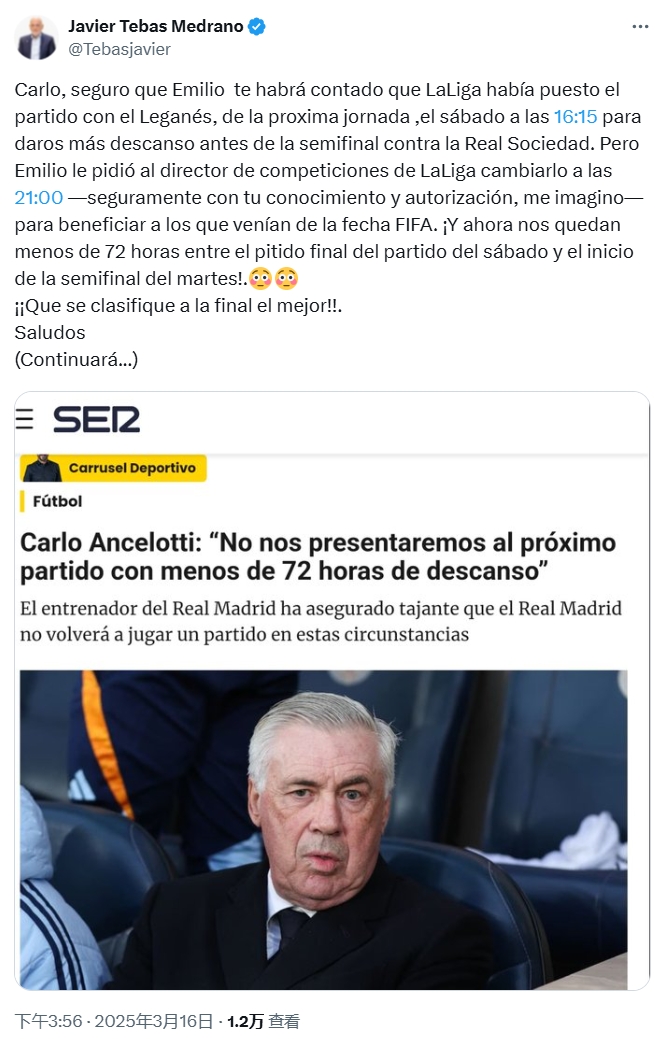 “卡洛,想必埃米里亞諾(皇馬高層布特拉格諾)肯定會(huì)告訴你,西甲為了讓你們有更多休息時(shí)間備戰(zhàn)皇家社會(huì)的半決賽,原本把萊加內(nèi)斯的比賽安排在周六的16:15。但埃米里亞諾卻請(qǐng)求西甲主管將比賽改期到21:00,想必你對(duì)此是知情并且批準(zhǔn)的吧?我猜,你們此舉是為了讓從國(guó)際比賽日回歸的球員有更多的休息時(shí)間,結(jié)果現(xiàn)在你看,從周六西甲聯(lián)賽結(jié)束到周二國(guó)王杯半決賽開(kāi)始,你們又只剩下不到72小時(shí)的休息時(shí)間!
