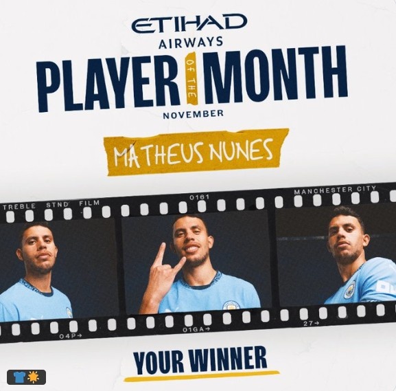 12月6日訊 曼城官方宣布,經(jīng)過(guò)投票,中場(chǎng)努內(nèi)斯當(dāng)選隊(duì)內(nèi)11月最佳球員。