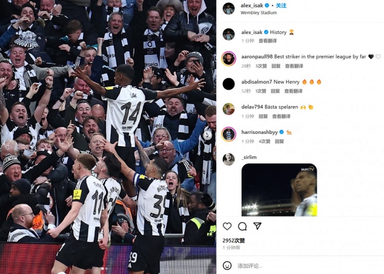 3月17日訊 紐卡在聯(lián)賽杯決賽2-1擊敗利物浦,時隔70年再次奪冠,進球功臣伊薩克也在賽后通過社媒慶祝。