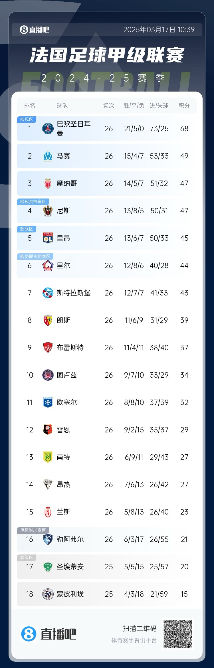 國(guó)際比賽日后,法甲第27輪,巴黎將客戰(zhàn)圣埃蒂安,馬賽則是客戰(zhàn)蘭斯,摩納哥與尼斯直接對(duì)話(huà)。如果巴黎贏球、馬賽輸球、摩納哥戰(zhàn)平尼斯,巴黎將在3月份就鎖定聯(lián)賽冠軍,提前7輪奪冠!