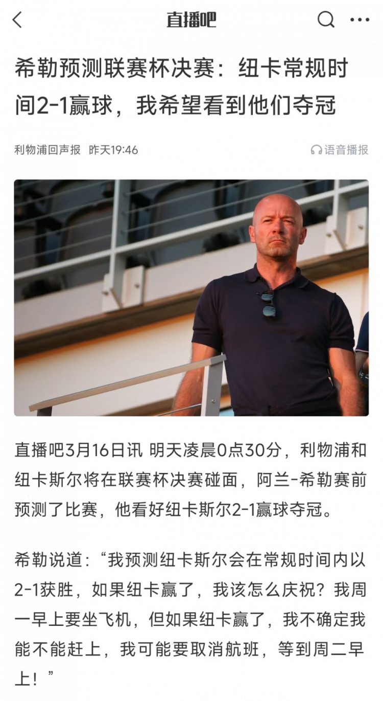 賽前,紐卡斯?fàn)柮薨⑻m-希勒在預(yù)測(cè)比賽時(shí)就準(zhǔn)確命中了比分,希勒當(dāng)時(shí)說道:“我預(yù)測(cè)紐卡斯?fàn)枙?huì)在常規(guī)時(shí)間內(nèi)以2-1獲勝,如果紐卡贏了,我該怎么慶祝?我周一早上要坐飛機(jī),但如果紐卡贏了,我不確定我能不能趕上,我可能要取消航班,等到周二早上!”