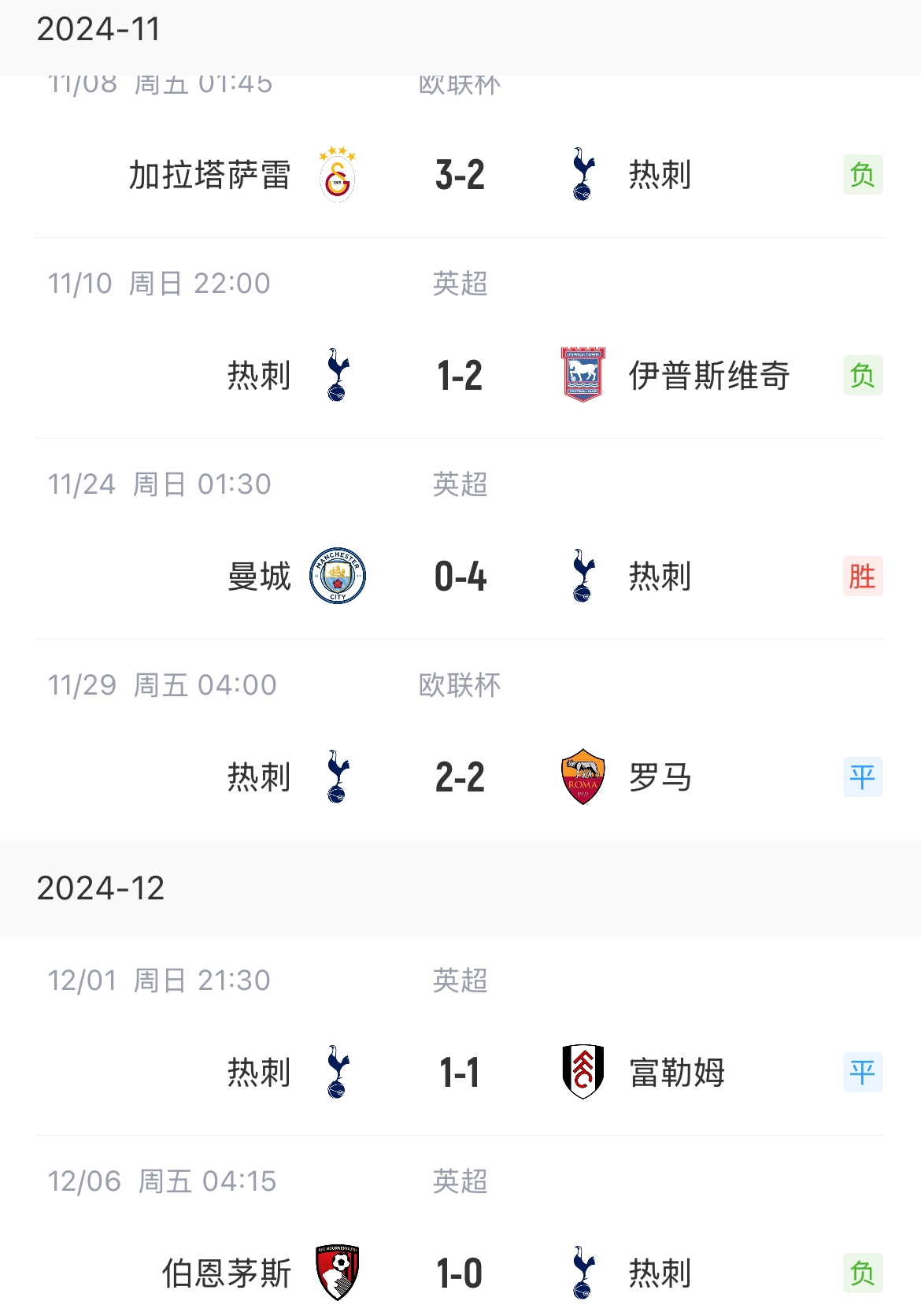 熱刺各賽事近6場1勝2平3負(fù),唯一贏球的是客場4-0曼城。