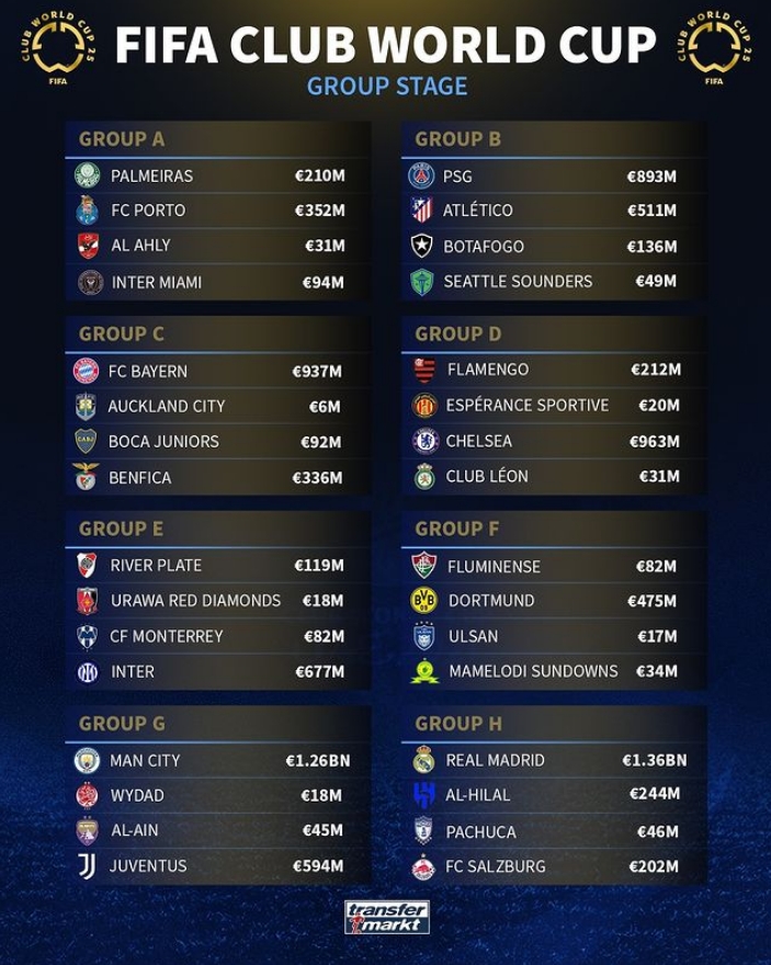 A組:帕爾梅拉斯(2.1億歐)、波爾圖(3.52億歐)、開(kāi)羅國(guó)民(3100萬(wàn)歐)、邁阿密國(guó)際(9400萬(wàn)歐)