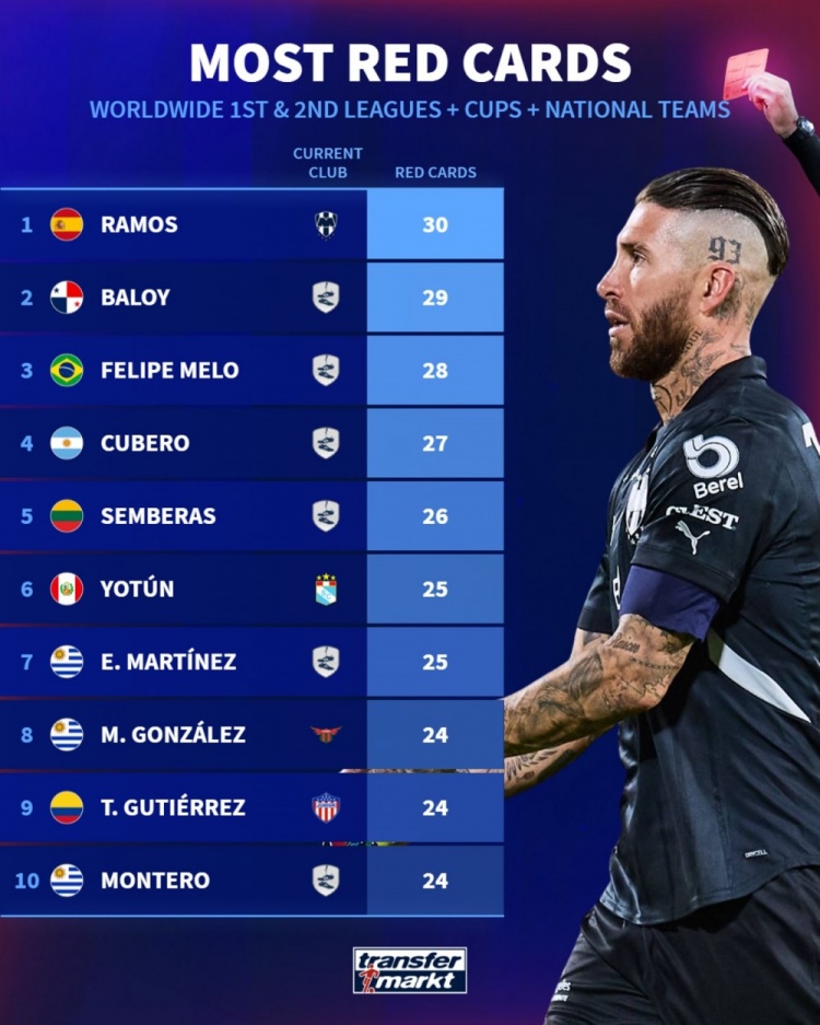 3月18日訊 墨西哥聯(lián)賽第12輪比賽,拉莫斯為蒙特雷首發(fā)出戰(zhàn),第92分鐘染紅離場(chǎng),最終蒙特雷客場(chǎng)3-1擊敗墨西哥美洲獅。德國轉(zhuǎn)會(huì)市場(chǎng)統(tǒng)計(jì)了球員吃到紅牌的數(shù)量,拉莫斯以30張紅牌居首。