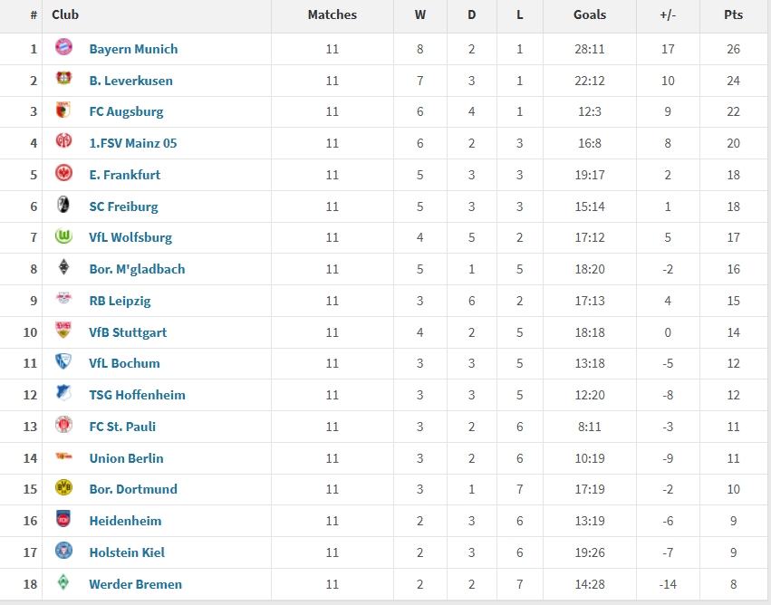 03月18日訊 2025年至今,德甲共進行了11場比賽,其中拜仁拿到26分最高,其次是24分的勒沃庫森,而萊比錫、多特分別僅拿到了15分和10分。