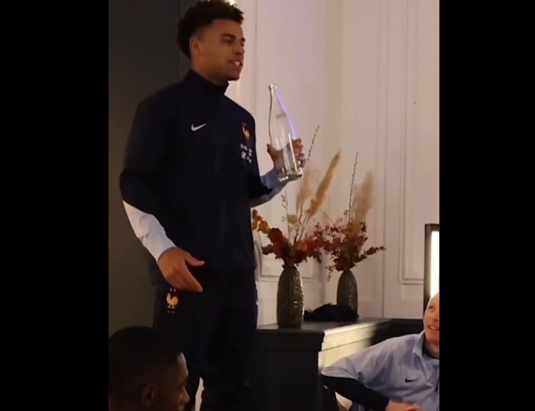 法國(guó)隊(duì)歷來(lái)有首次入選的球員需要在全隊(duì)面前唱歌的傳統(tǒng),杜埃也延續(xù)了這一傳統(tǒng),拿起玻璃瓶當(dāng)話筒,但聽起來(lái)似乎仍然有些放不開……但好在隊(duì)友們都相當(dāng)捧場(chǎng),全都送上了熱烈的掌聲鼓勵(lì)。