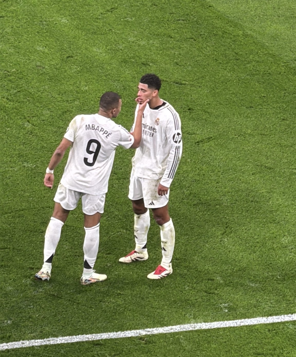 12月3日訊 本賽季西甲第15輪,皇馬主場(chǎng)2-0擊敗赫塔費(fèi)。賽中的一幕在網(wǎng)絡(luò)上傳播,當(dāng)時(shí)姆巴佩捏著貝林厄姆的臉頰,查看他的鼻子。