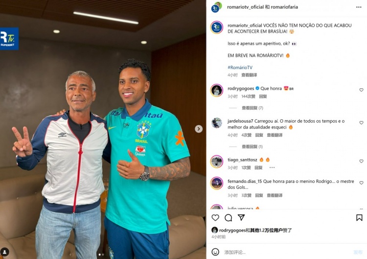 3月19日訊 巴西國(guó)家隊(duì)已經(jīng)集結(jié)備戰(zhàn)新一輪南美世預(yù)賽,羅德里戈、拉菲尼亞以及恩德里克三人做客Roma?rioTV節(jié)目,與巴西傳奇球星羅馬里奧合影留念。