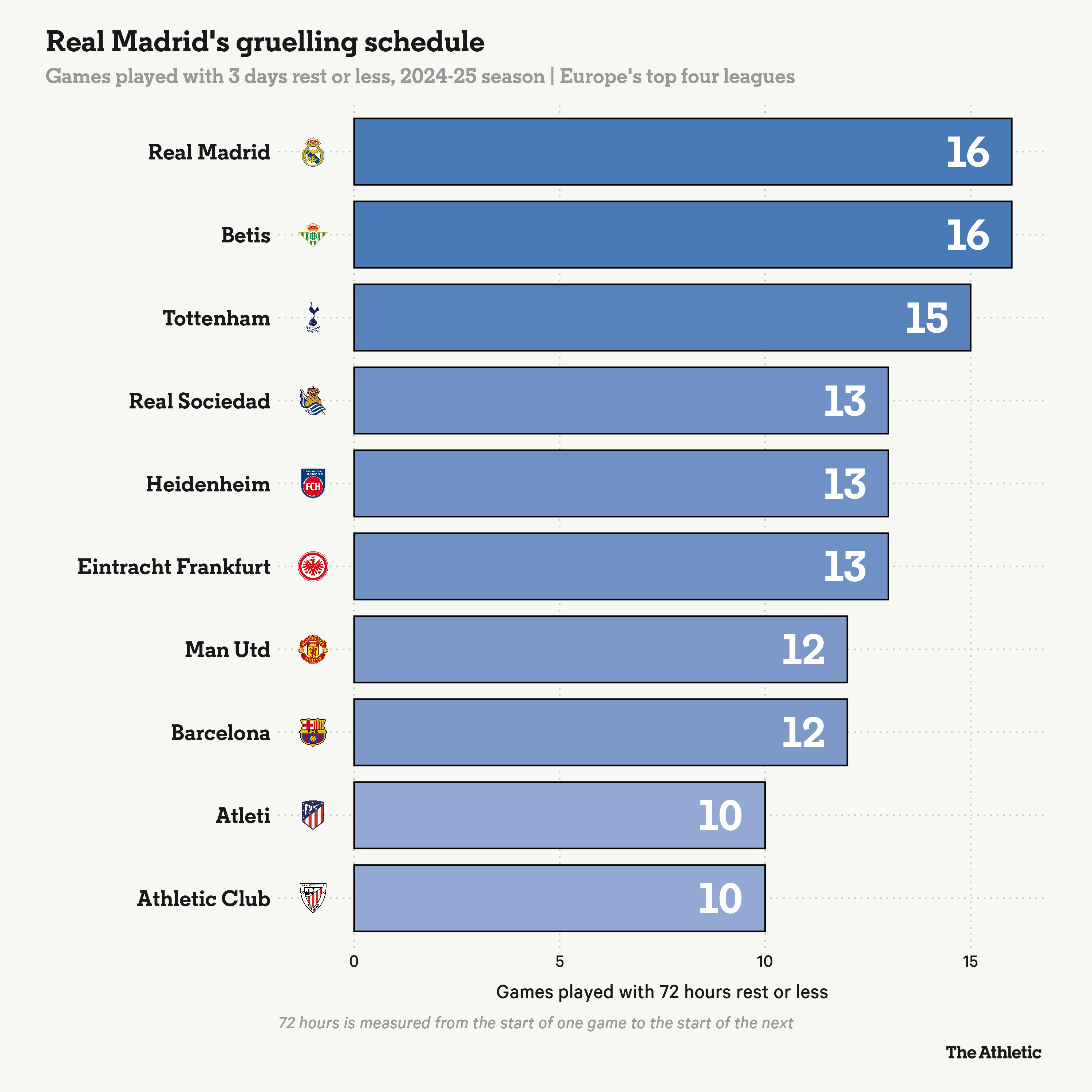 3月19日訊 根據(jù)The Athletic統(tǒng)計,皇馬本賽季有16場比賽休息不多于72個小時。