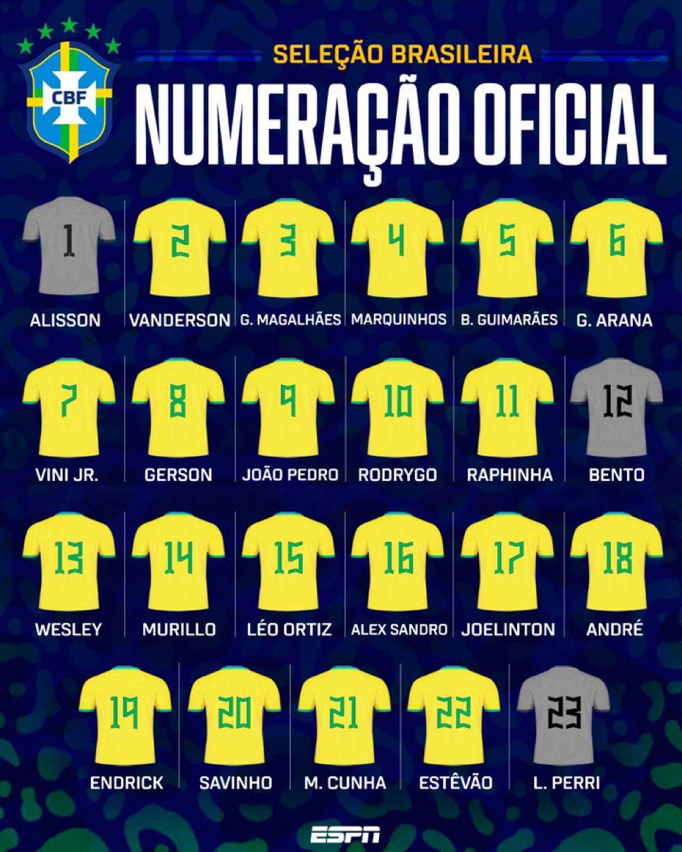 除特別注明外,本站所有內(nèi)容均為24直播網(wǎng)整理排版,轉(zhuǎn)載請注明出處:巴西最新號碼:若昂-佩德羅9號、維尼修斯7號、羅德里戈10號