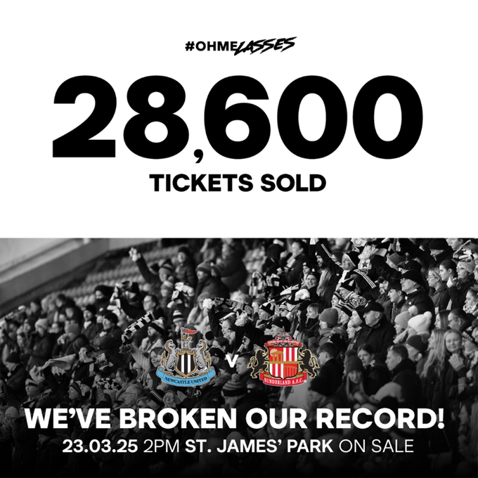 3月20日訊 紐卡女足官方發(fā)文,球隊在女足英冠主場迎戰(zhàn)桑德蘭女足的比賽售出28600張票,這創(chuàng)下了紐卡女足的隊史紀錄。