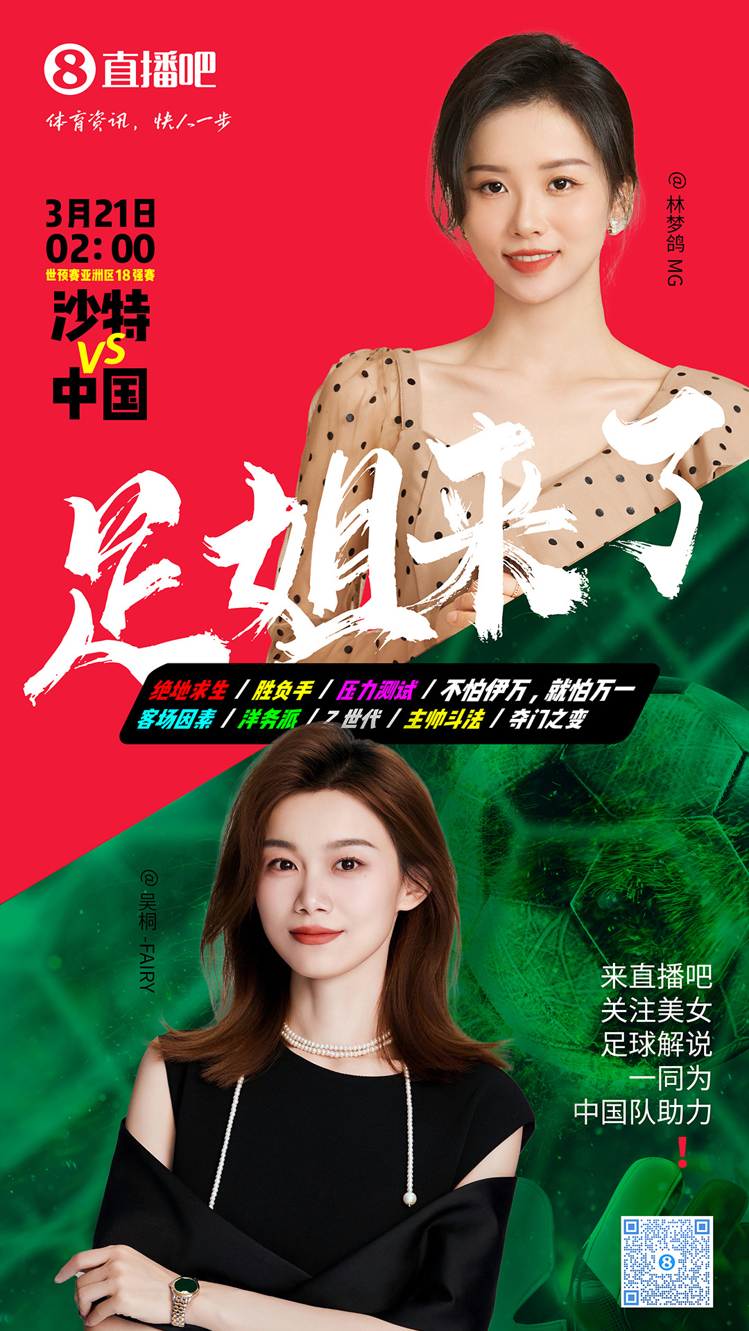 北京時(shí)間3月21日星期五02:15,世預(yù)賽亞洲區(qū)第三階段C組第7輪,中國男足客場挑戰(zhàn)沙特。本場世預(yù)賽,仍是邀請了兩位美女解說林夢鴿、吳桐進(jìn)行直播,02:00開始陪吧友們一起看國足!