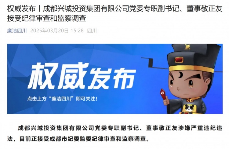 3月20日訊 根據(jù)“廉潔四川”公眾號消息,成都興城投資集團(tuán)有限公司黨委專職副書記、董事敬正友接受紀(jì)律審查和監(jiān)察調(diào)查。