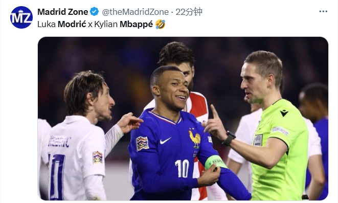 隨后,莫德里奇找裁判投訴姆巴佩,姆總一臉尬笑。