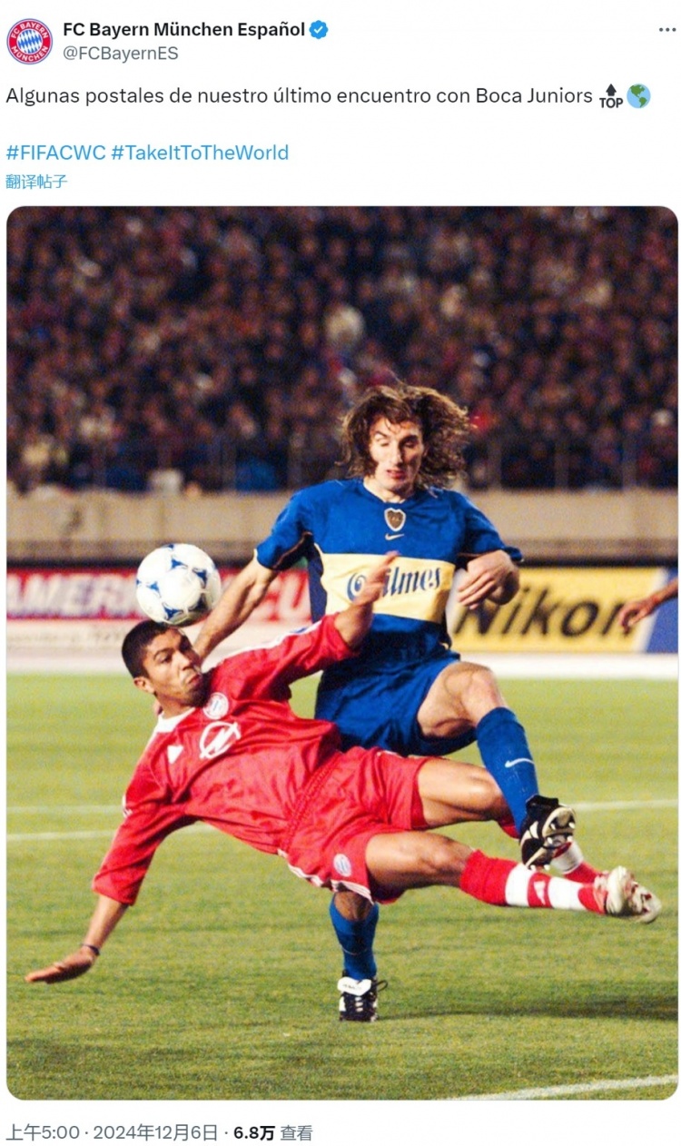 拜仁官方社媒曬出當(dāng)時的比賽照片,并配文:“我們上次與博卡青年交手的照片?!?/p>