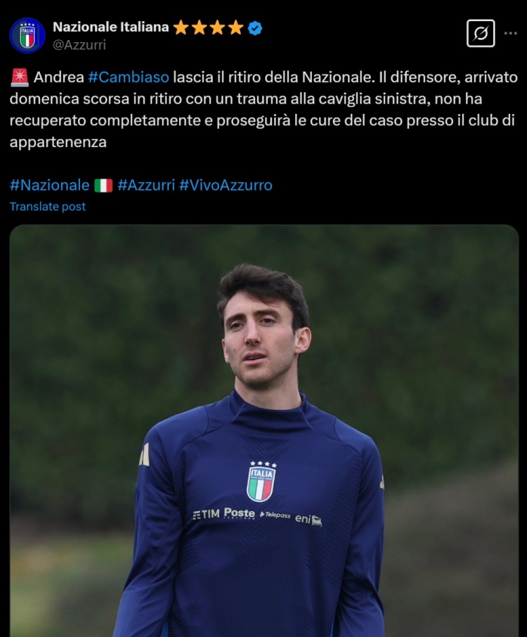 今天,意大利國家隊確認(rèn),坎比亞索將提前離開國家隊集訓(xùn)基地。這名后衛(wèi)上周日因左腳踝受傷抵達(dá)了國家隊休養(yǎng)所,目前尚未完全康復(fù),他將回到俱樂部繼續(xù)接受必要的治療。