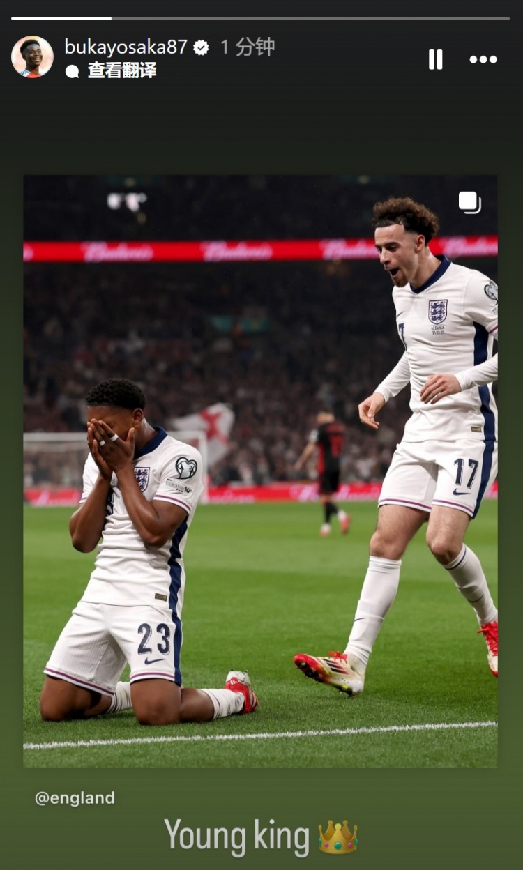 薩卡轉(zhuǎn)發(fā)了斯凱利慶祝進(jìn)球時的照片,并稱贊道:年輕的國王