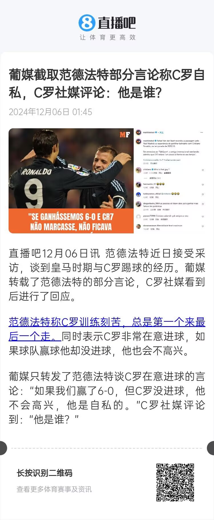 葡媒報(bào)道范德法特對(duì)C羅的評(píng)價(jià),單獨(dú)拎出一句“如果我們6-0贏球但C羅沒進(jìn)球,他不會(huì)高興,他是自私的”,C羅下場留言回懟:“這人是誰???”