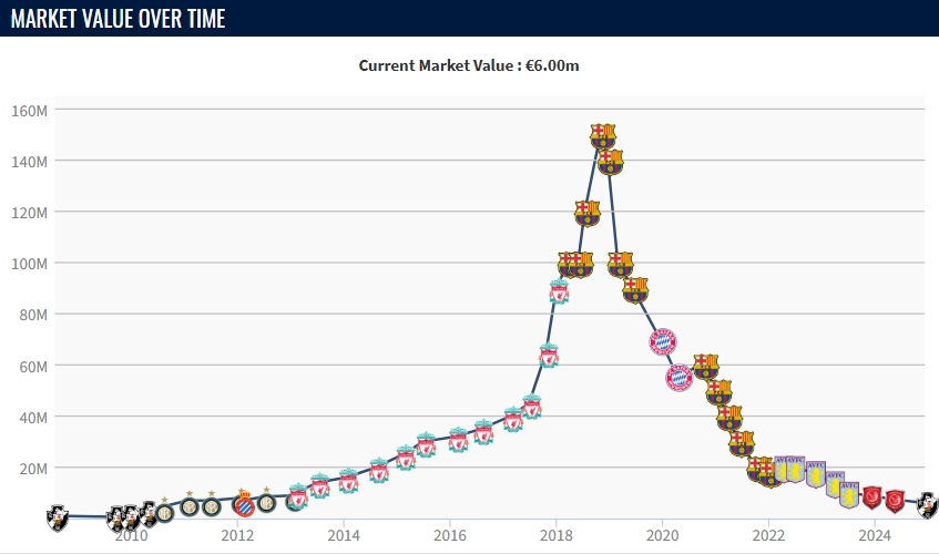 庫(kù)蒂尼奧目前德轉(zhuǎn)身價(jià)僅為600萬(wàn)歐元,他巔峰時(shí)期德轉(zhuǎn)身價(jià)高達(dá)1.5億歐元。在2018年冬窗,巴薩花費(fèi)1.35億歐元將他簽下,隨后他被租往拜仁,并于2022年以2000萬(wàn)轉(zhuǎn)會(huì)費(fèi)永久轉(zhuǎn)會(huì)維拉。