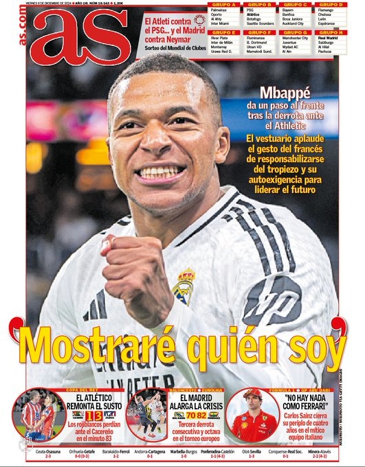 12月6日訊 西班牙媒體《阿斯報(bào)》更新社媒動(dòng)態(tài),曬出了今日的頭版內(nèi)容。