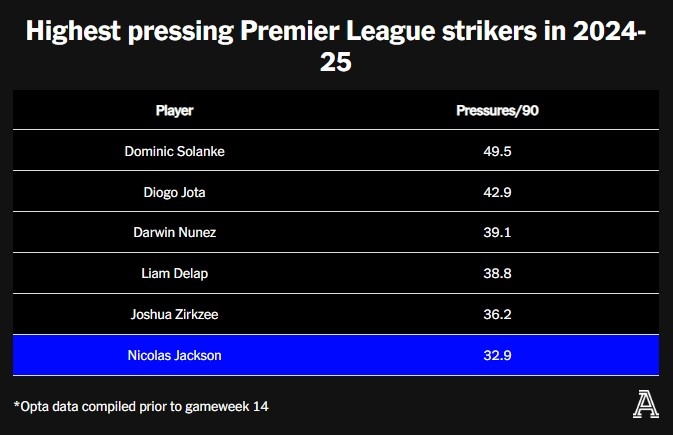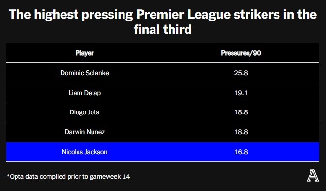 在本賽季英超前鋒平均每90分鐘壓迫次數(shù)排行榜上,索蘭克49.5次排名第一,若塔42.9次排名第二,努涅斯(39.1次)、德拉普(38.8次)、齊爾克澤(36.2次)、杰克遜(32.9次)分列三至六位。