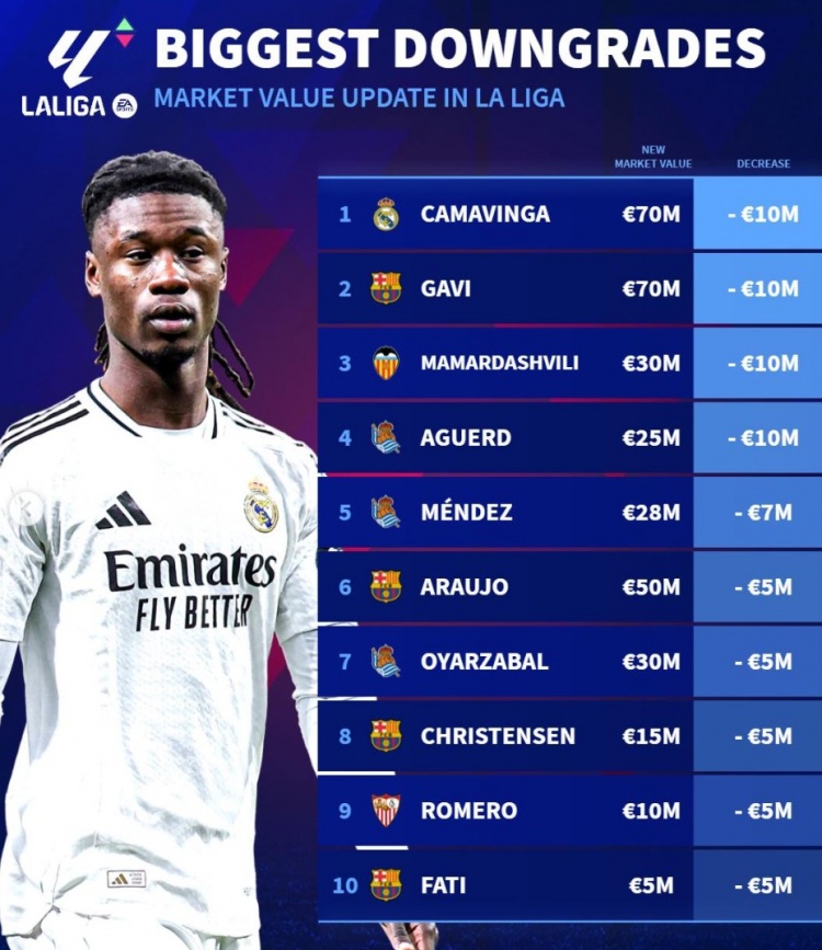 西甲身價貶值榜:加維、法蒂領(lǐng)銜巴薩4將,卡馬文加&瑪瑪達(dá)在列
