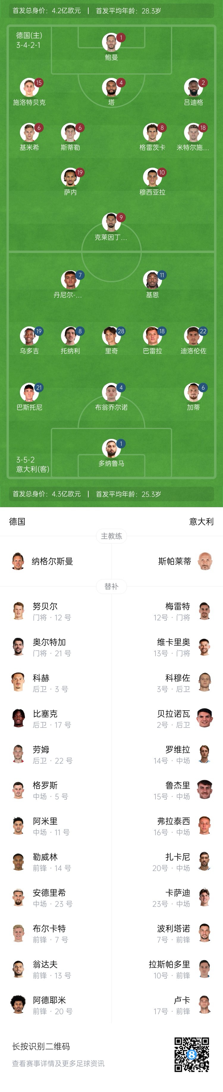 3月24日訊 歐國聯(lián)1/4決賽次回合,德國vs意大利首發(fā)出爐。陣容更新中。首回合對陣,德國2-1意大利。
