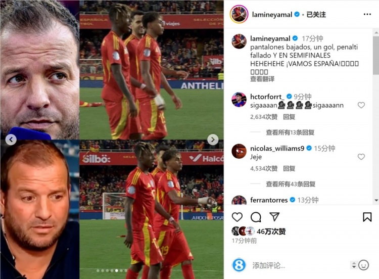 晉級之后,亞馬爾在社交媒體上曬出自己的賽場照,以及范德法特的照片,并寫道:“球褲低穿、打進(jìn)一球、點球失手、晉級半決賽。哈哈哈,西班牙加油!”