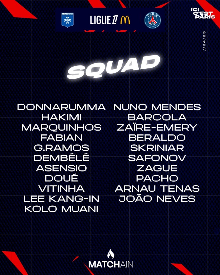 巴黎客戰(zhàn)歐塞爾大名單