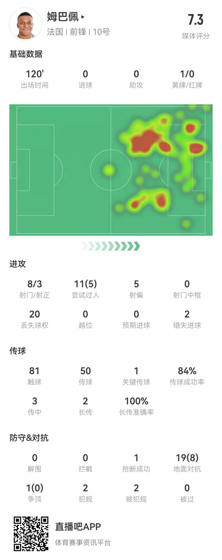 3月24日訊 法國在歐國聯(lián)八強(qiáng)戰(zhàn)次回合再戰(zhàn)克羅地亞,姆巴佩本場(chǎng)數(shù)據(jù)如下: