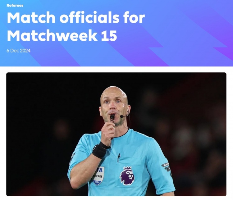 12月6日訊 英超官方公布第15輪聯(lián)賽各場執(zhí)法裁判,奧利弗執(zhí)法默西塞德德比,安東尼-泰勒執(zhí)法熱刺vs切爾西。