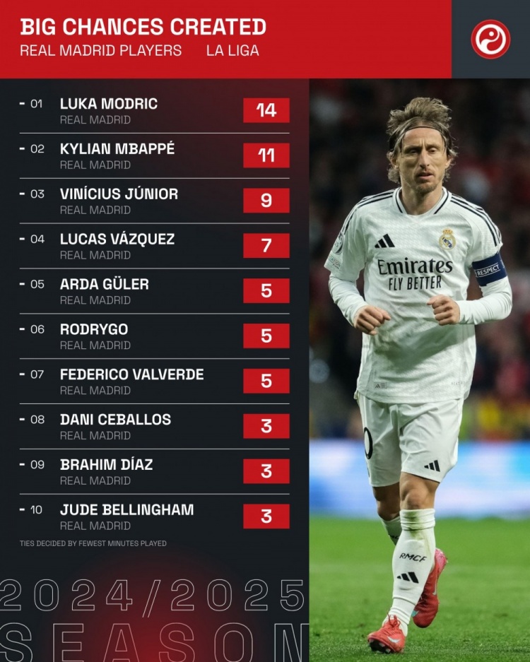 據統(tǒng)計,盡管本賽季只首發(fā)出戰(zhàn)了11場比賽,但莫德里奇本賽季在西甲創(chuàng)造機會的次數仍然是全隊最高,比第二名的姆巴佩多出三次。