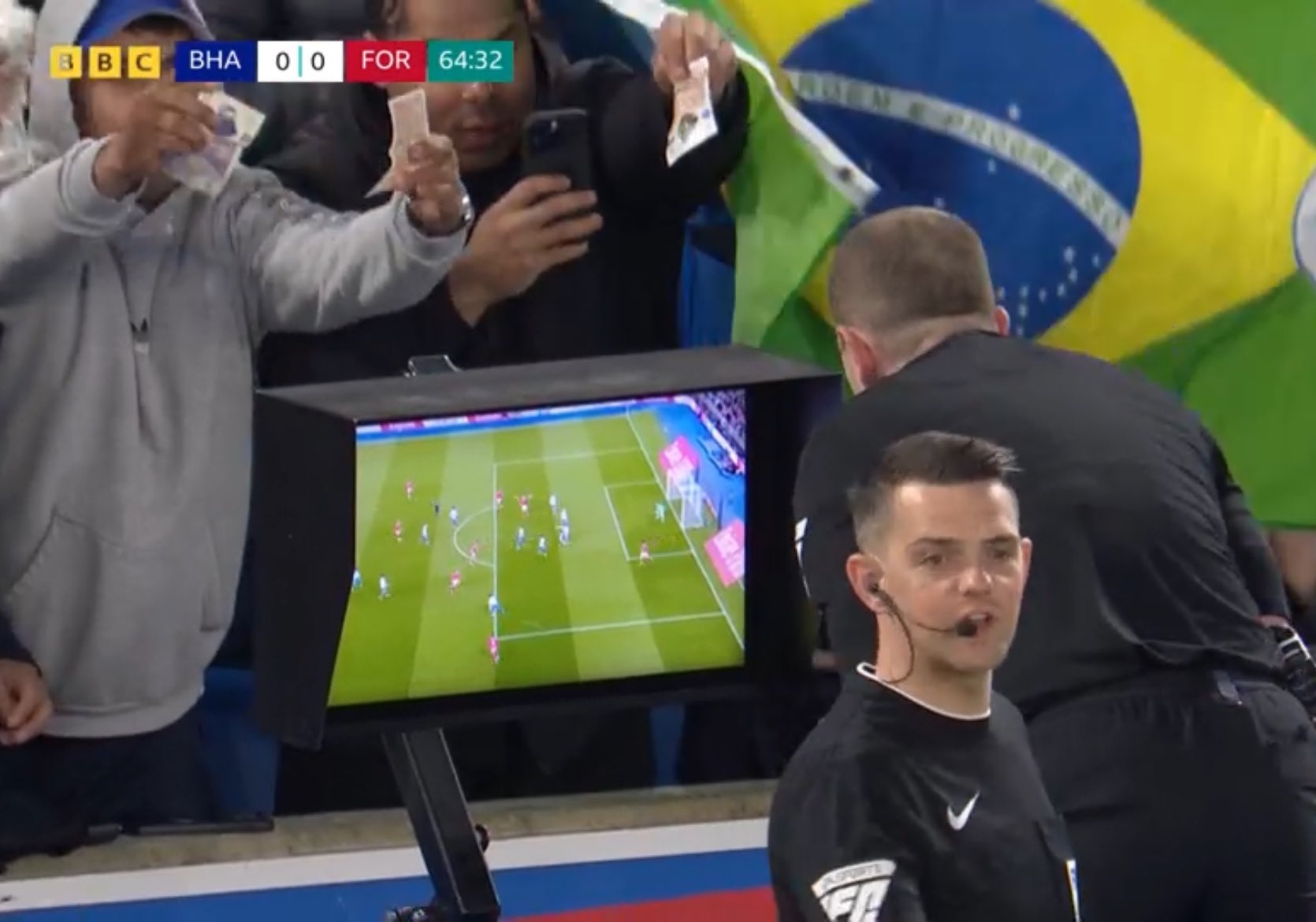 在這場比賽的第64分鐘森林曾獲得一個(gè)點(diǎn)球,但是裁判觀看VAR之后,將這粒點(diǎn)球取消。有趣的是,裁判在觀看VAR的時(shí)候,球迷在設(shè)備后面揮舞鈔票。