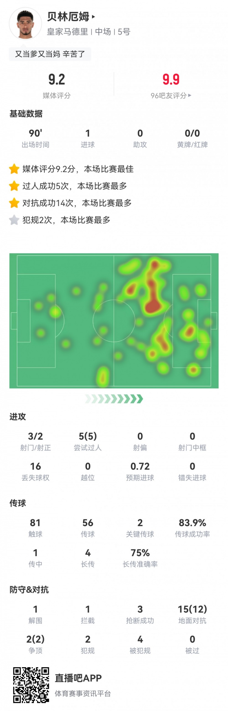3月30日訊 本輪西甲,皇馬3-2萊加內(nèi)斯。此役貝林厄姆首發(fā)打滿全場(chǎng),球員全場(chǎng)重點(diǎn)數(shù)據(jù)如下↓