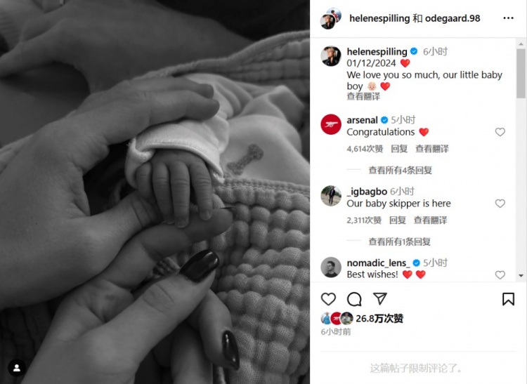 厄德高曬出了自己與妻子、兒子三個(gè)人的手部合照,并配文:“2024年12月1日??我們的寶貝男孩,我們是如此愛(ài)你