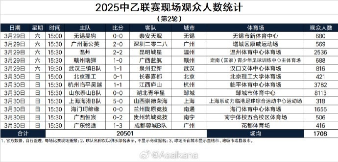 3月31日訊 據(jù)德轉(zhuǎn)中國區(qū)管理員朱藝統(tǒng)計(jì),中乙第2輪場均現(xiàn)場觀眾1708人,四場比賽觀眾超千人,其中泰山B隊(duì)主場8113人最多。