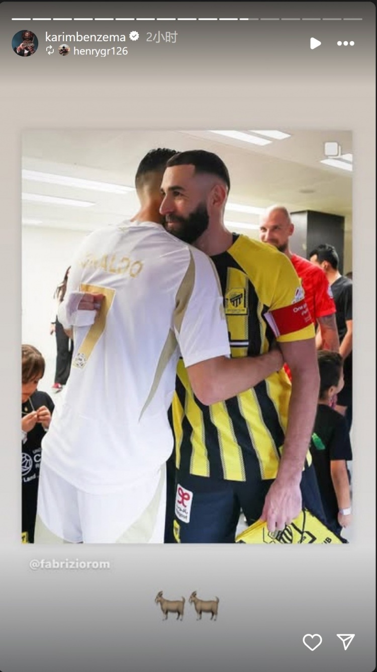 本澤馬賽后更新社媒動態(tài),曬出與昔日皇馬隊友C羅賽前擁抱的照片,C羅也在這場比賽中取得了進(jìn)球。