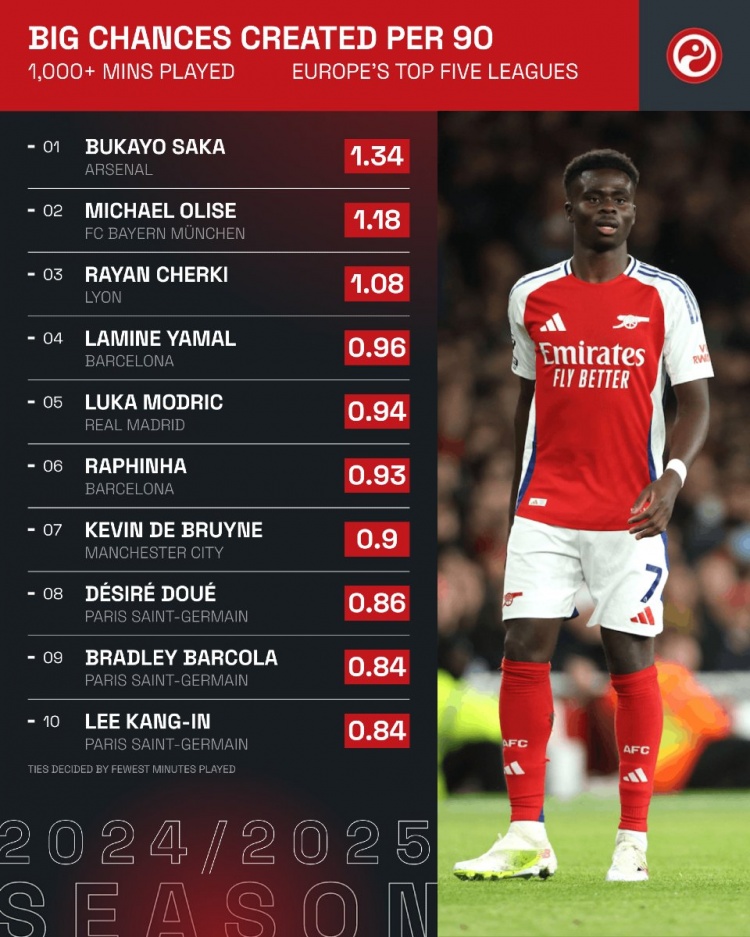 除特別注明外,本站所有內(nèi)容均為24直播網(wǎng)整理排版,轉(zhuǎn)載請(qǐng)注明出處:五大聯(lián)賽每90分鐘創(chuàng)造重大機(jī)會(huì)榜:薩卡1.34次居首,奧利塞次席