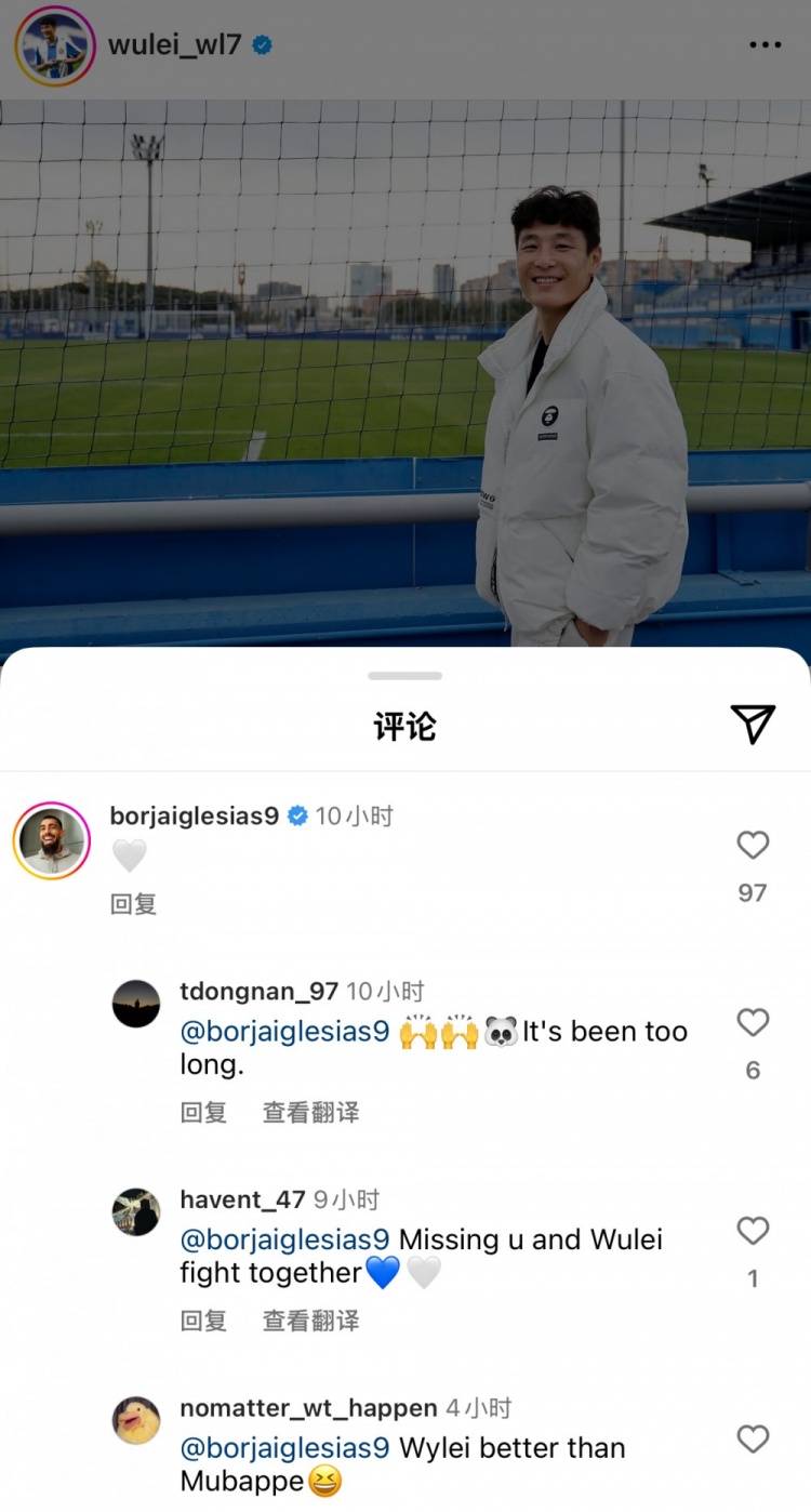 伊格萊西亞斯在武磊的這條社媒留下了一個(gè)“愛心”的表情。有西班牙人球迷回復(fù)伊格萊西亞斯:“想念你和武磊并肩作戰(zhàn)的日子?!币灿星蛎哉{(diào)侃寫道:“武磊比姆巴佩更好?!?/p>