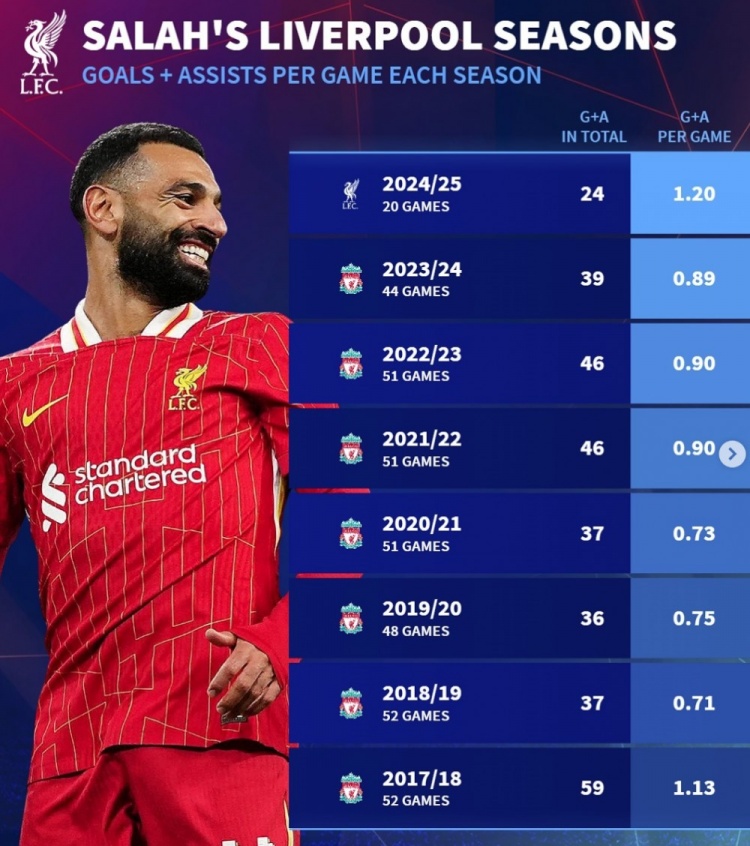 薩拉赫紅軍生涯各賽季場均參與進(jìn)球: