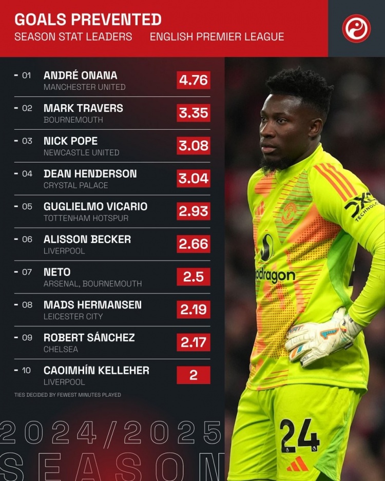 12月3日訊 squawka統(tǒng)計(jì)了本賽季英超門將的有效撲救榜,奧納納以4.76球居首。