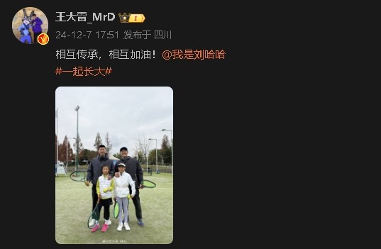 12月7日訊 泰山隊門將王大雷更新社媒,曬出他和劉殿座以及孩子們打網(wǎng)球的合照+附文:相互傳承,相互加油!