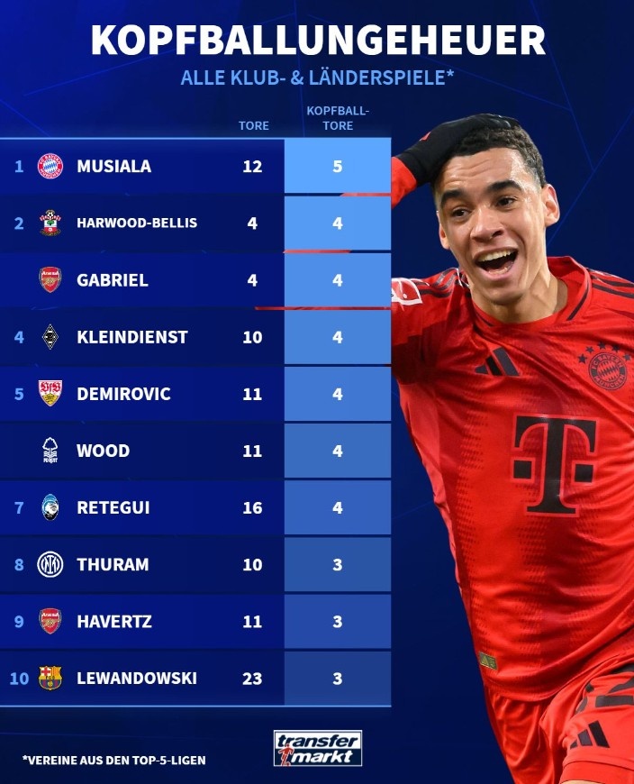 12月3日訊 拜仁攻擊手穆西亞拉有著不錯(cuò)的頭球能力,根據(jù)德國(guó)轉(zhuǎn)會(huì)市場(chǎng)的統(tǒng)計(jì),他是本賽季五大聯(lián)賽在國(guó)家隊(duì)和俱樂部打進(jìn)頭球最多的球員,他的12粒進(jìn)球中有5球都是頭球。