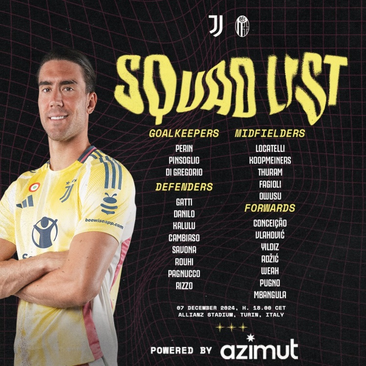 12月7日訊 北京時(shí)間明天凌晨1點(diǎn),尤文將在意甲第15輪比賽中主場(chǎng)對(duì)陣博洛尼亞。尤文公布了此役的球員名單,弗拉霍維奇、阿季奇回歸,小孔塞桑、庫(kù)普梅納斯、伊爾迪茲在列。