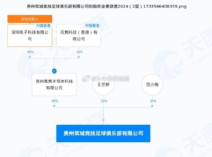 12月7日訊 博主“小牛體育微報”報道,剛剛完成沖乙目標的貴州筑城競技足球俱樂部完成實控人變更,貴州集雋半導體科技有限公司成為俱樂部實際控制人。