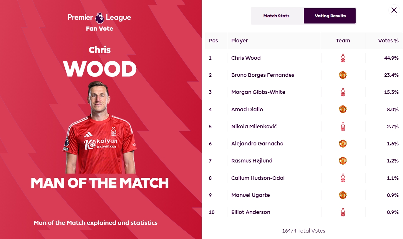 賽后,英超官方宣布,克里斯-伍德當(dāng)選本場比賽的最佳球員,他獲得了44.9%的得票率。