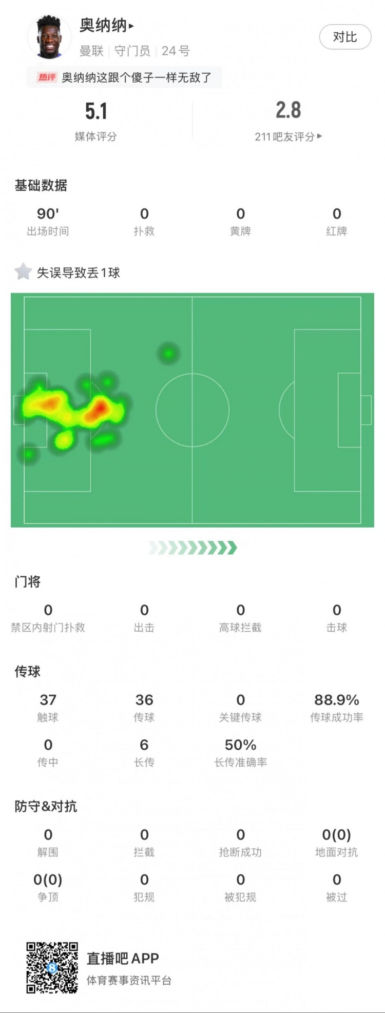 12月8日訊 英超本輪比賽,曼聯(lián)2-3森林,奧納納本場數(shù)據(jù):