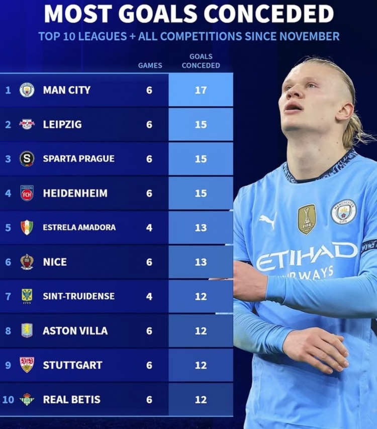 11月至今前十聯(lián)賽球隊(duì)各項(xiàng)賽事失球榜: