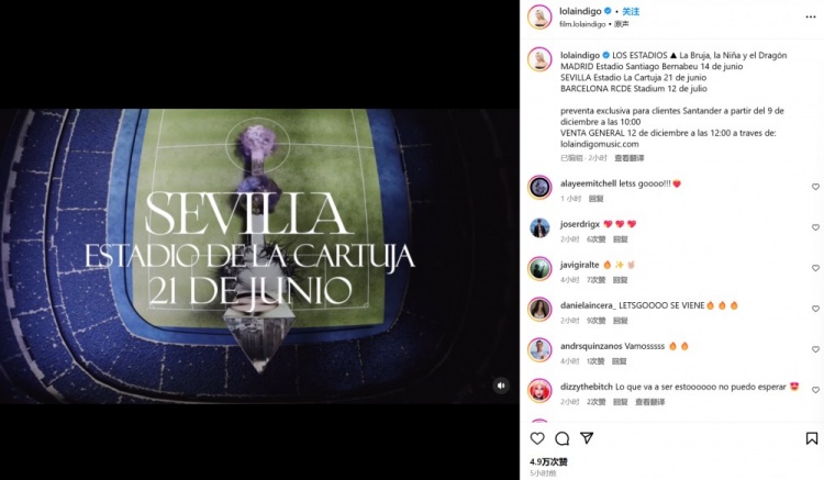 12月3日訊 西班牙人氣歌手Lola Indigo在今日宣布明夏西班牙演唱會(huì)日程,其中伯納烏球場(chǎng)將在6月14日承辦馬德里的演唱會(huì)?;蜀R官方對(duì)此發(fā)布了聲明: